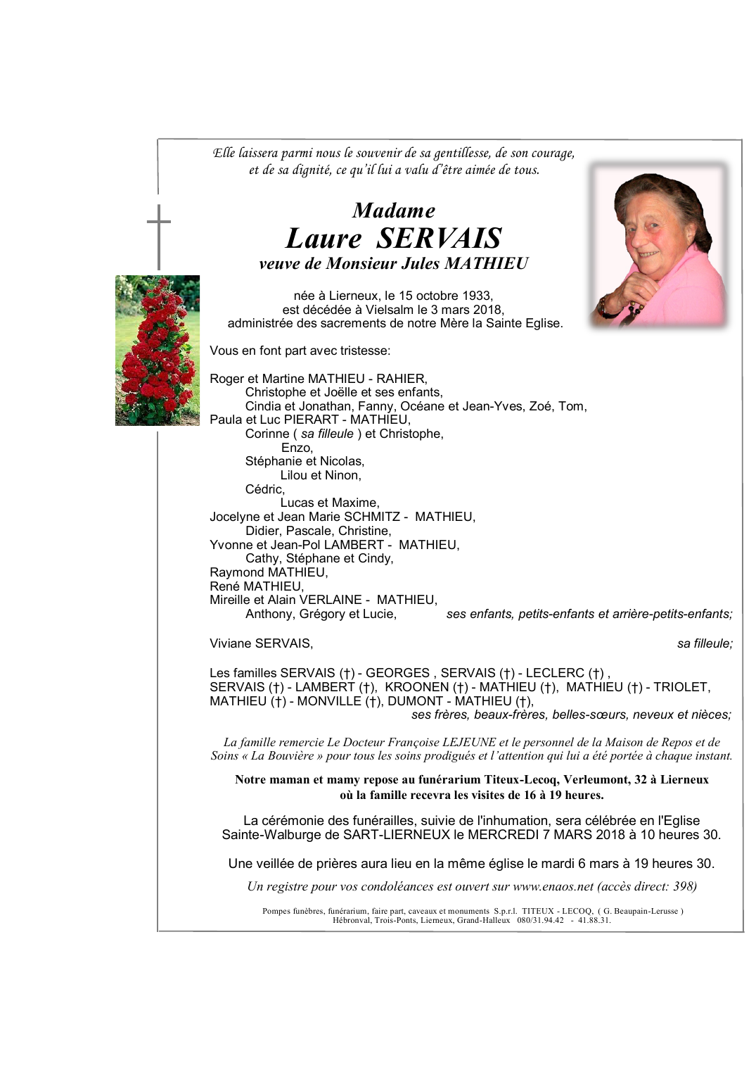 Née à Lierneux (4990) le dimanche 15 octobre 1933