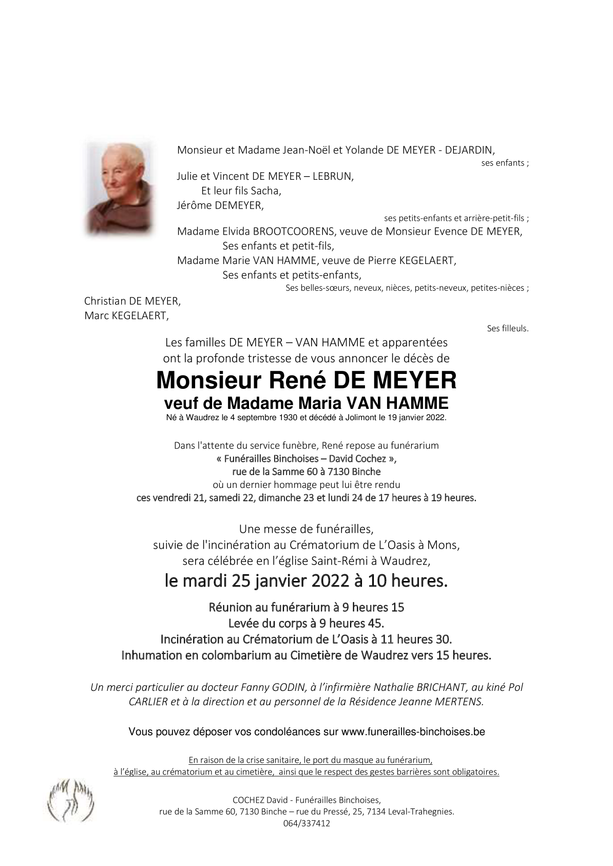 Décédé à Haine-Saint-Paul (7100) le mercredi 19 janvier 2022 à l'âge de 91 ans