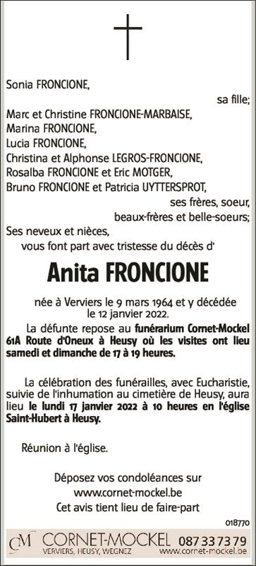 Décédée à Verviers (4800) le mercredi 12 janvier 2022 à l'âge de 57 ans