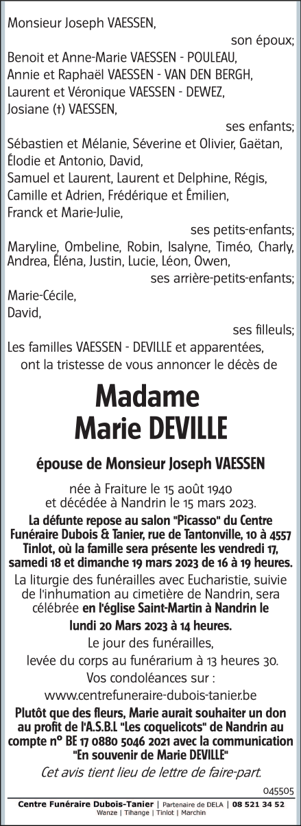 Overleden te Nandrin (4550) op woensdag 15 maart 2023 op 82-jarige leeftijd