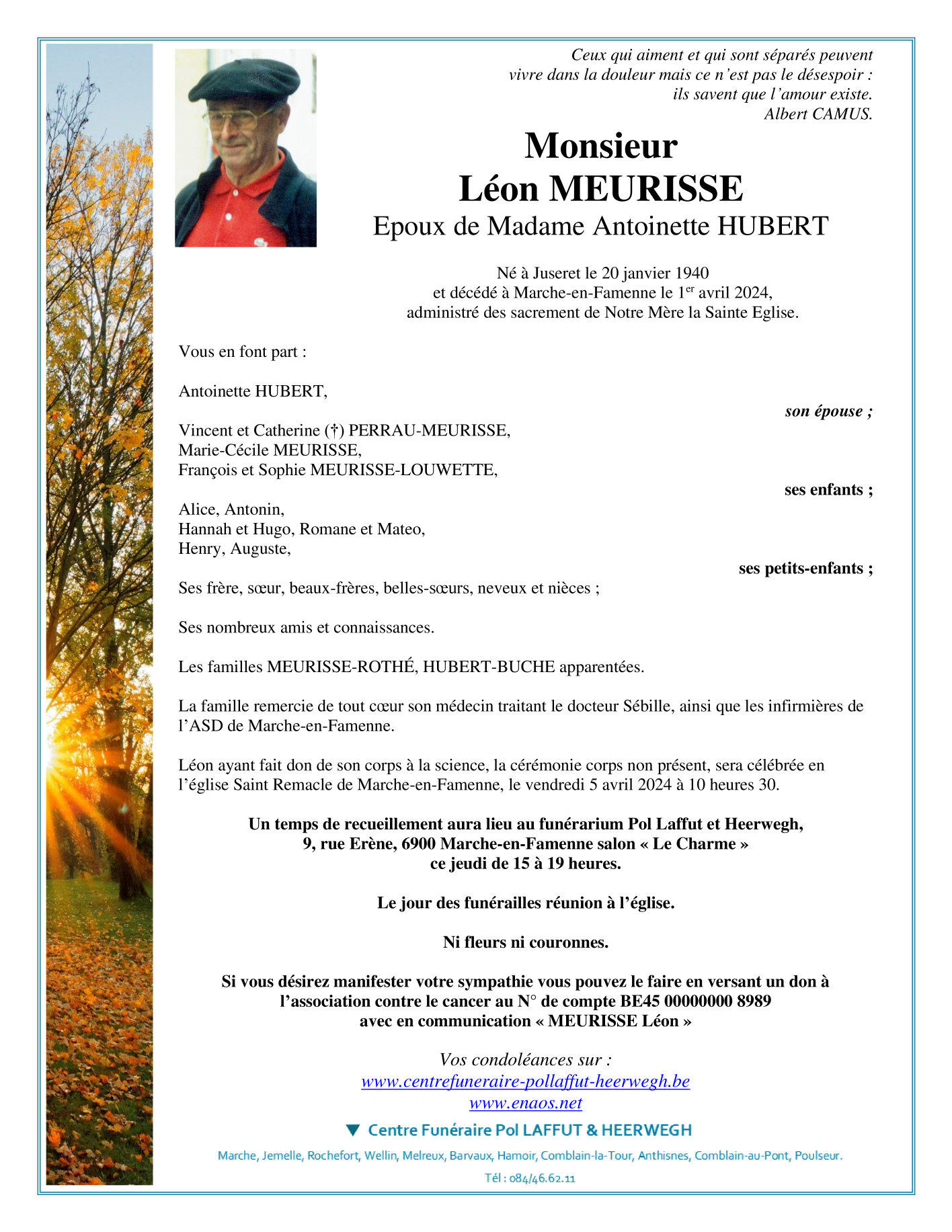 Fallecido en Marche-en-Famenne (6900) el lunes, 1 de abril de 2024 a la edad de 84 años