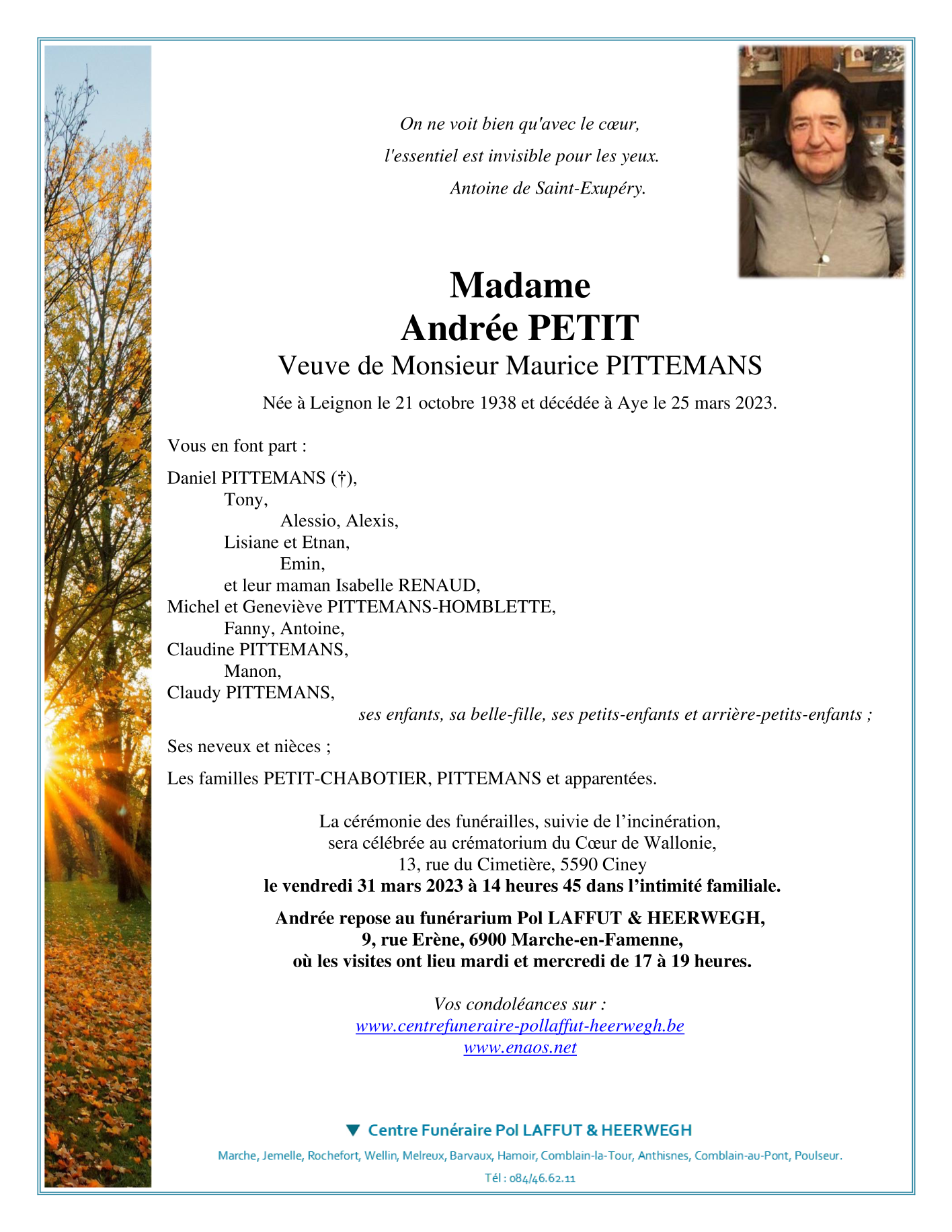 Née à Leignon (5590) le vendredi 21 octobre 1938