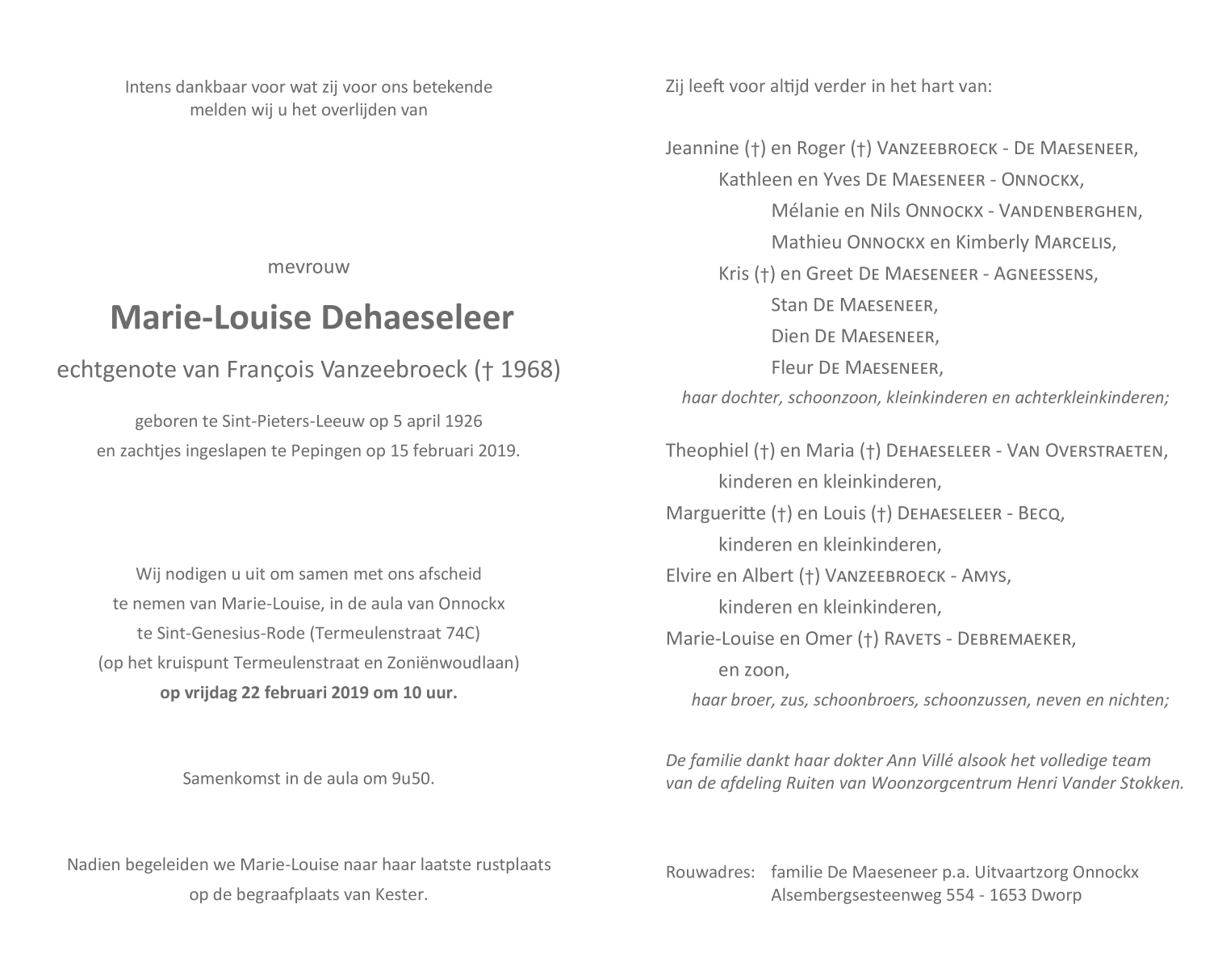 Overleden te Pepingen (1670) op vrijdag 15 februari 2019 op 92-jarige leeftijd