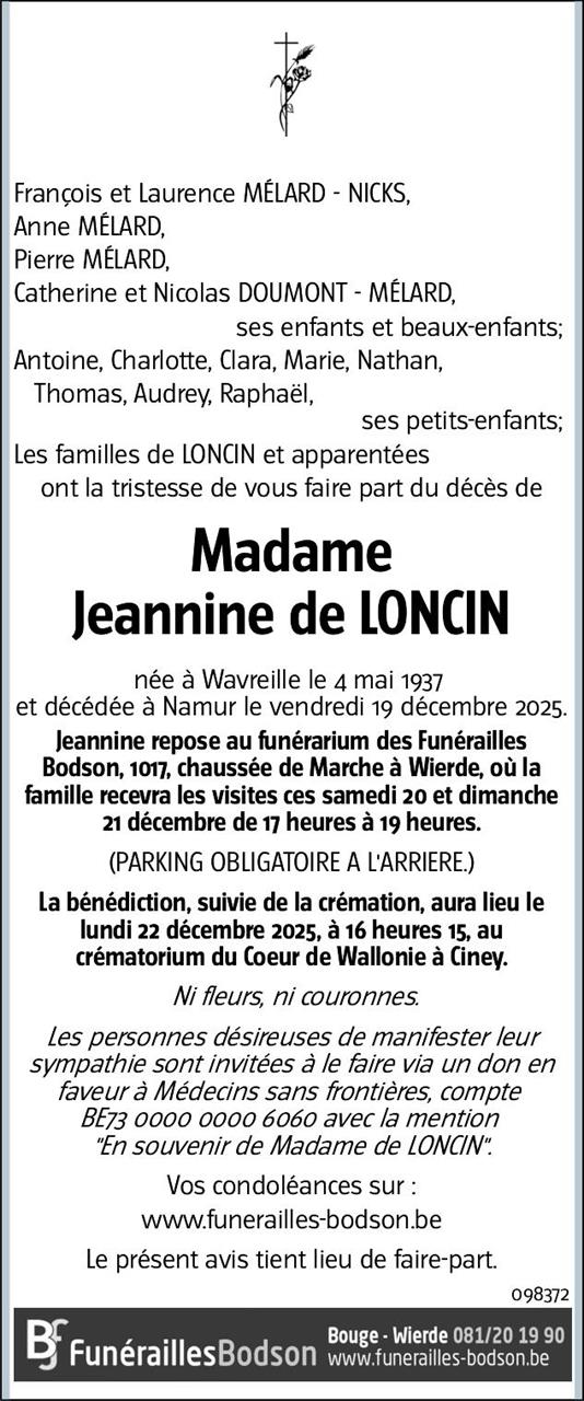 Décédée à Namur (5000) le vendredi 19 décembre 2025 à l'âge de 88 ans