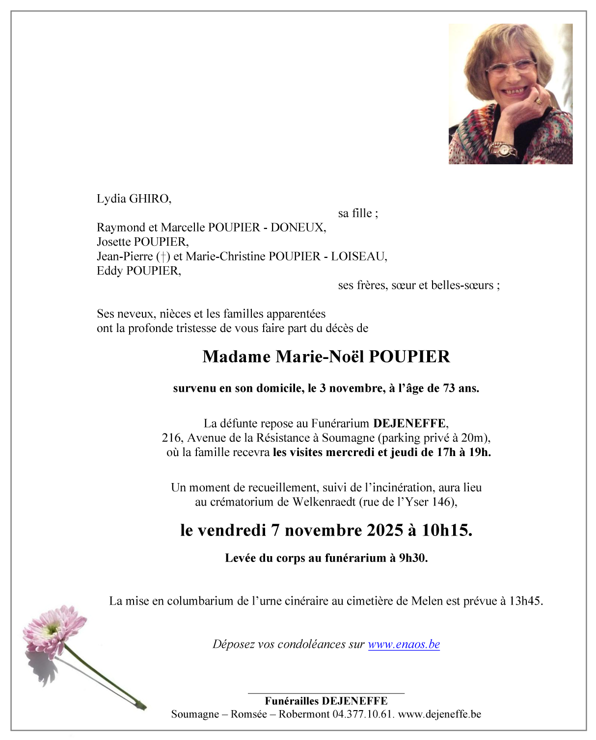 Décédée à Soumagne (4630) le lundi 3 novembre 2025 à l'âge de 73 ans