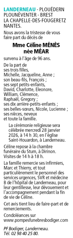 Died in Landerneau (29800, France) on 23 January 2026 at the age of 96 years