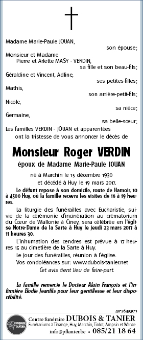 Died in Huy (4500) on 19 March 2017 at the age of 86 years