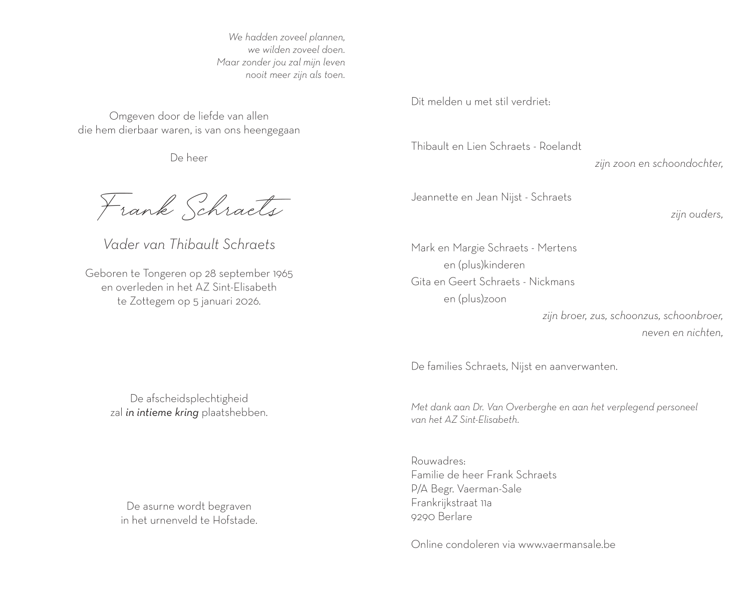 Died in Zottegem (9620) on 05 January 2026 at the age of 60 years
