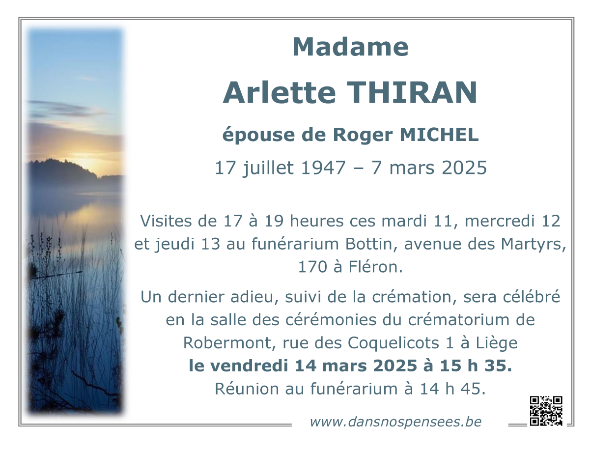 Décédée à Liège (4000) le vendredi 7 mars 2025 à l'âge de 77 ans