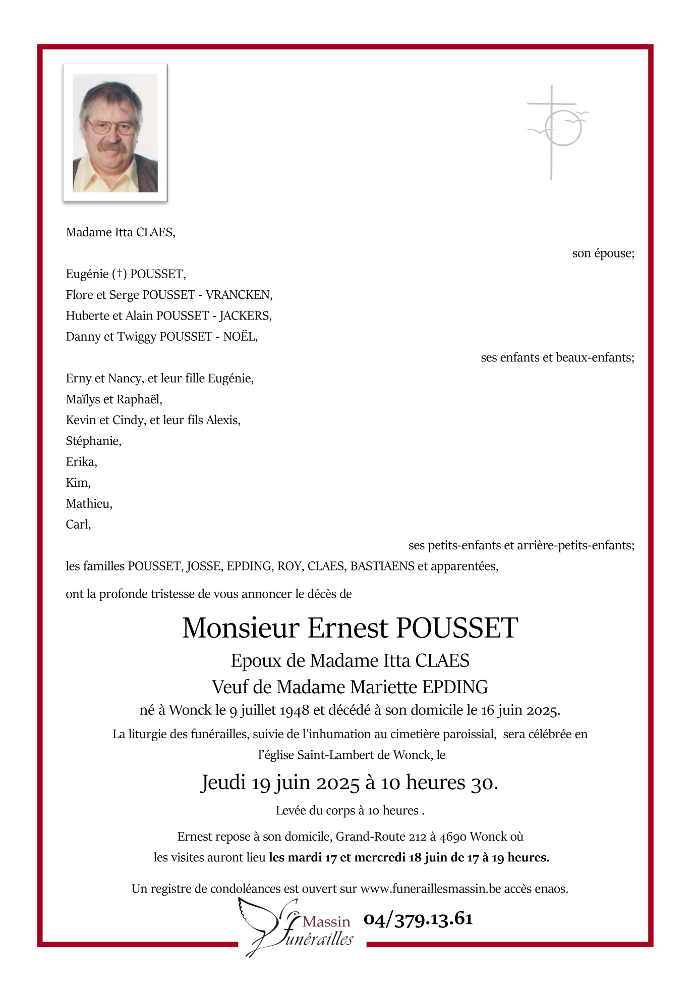 Décédé à Wonck (4690) le lundi 16 juin 2025 à l'âge de 76 ans