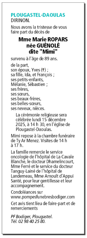 Décédée à Landerneau (29800, France) le mercredi 10 décembre 2025 à l'âge de 89 ans