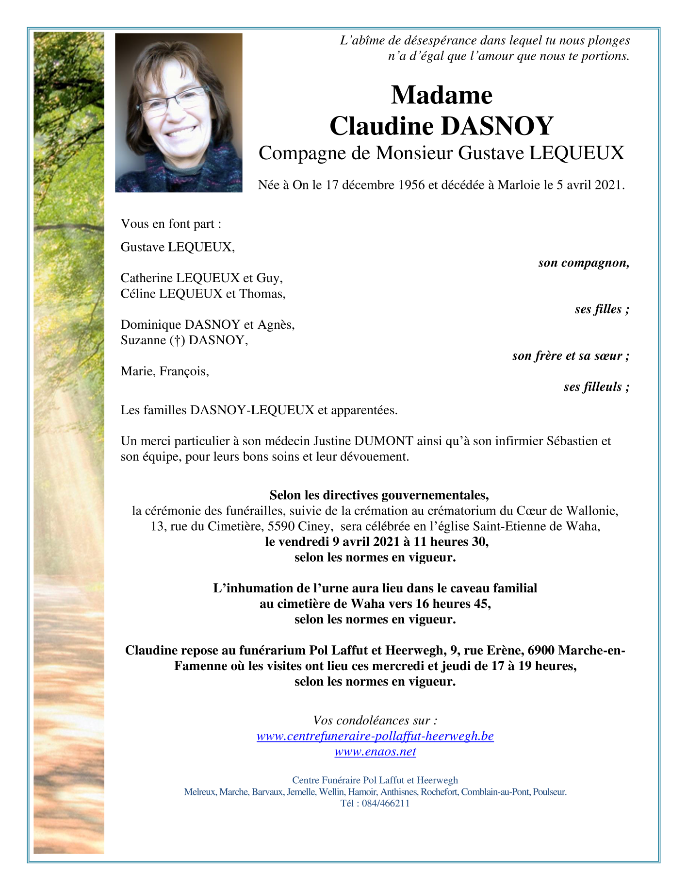 Décédée à Marloie (6900) le lundi 5 avril 2021 à l'âge de 64 ans