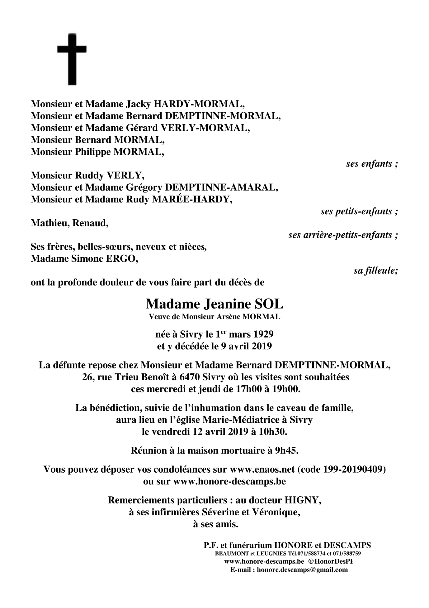 Fallecida en Sivry (6470) el martes, 9 de abril de 2019 a la edad de 90 años