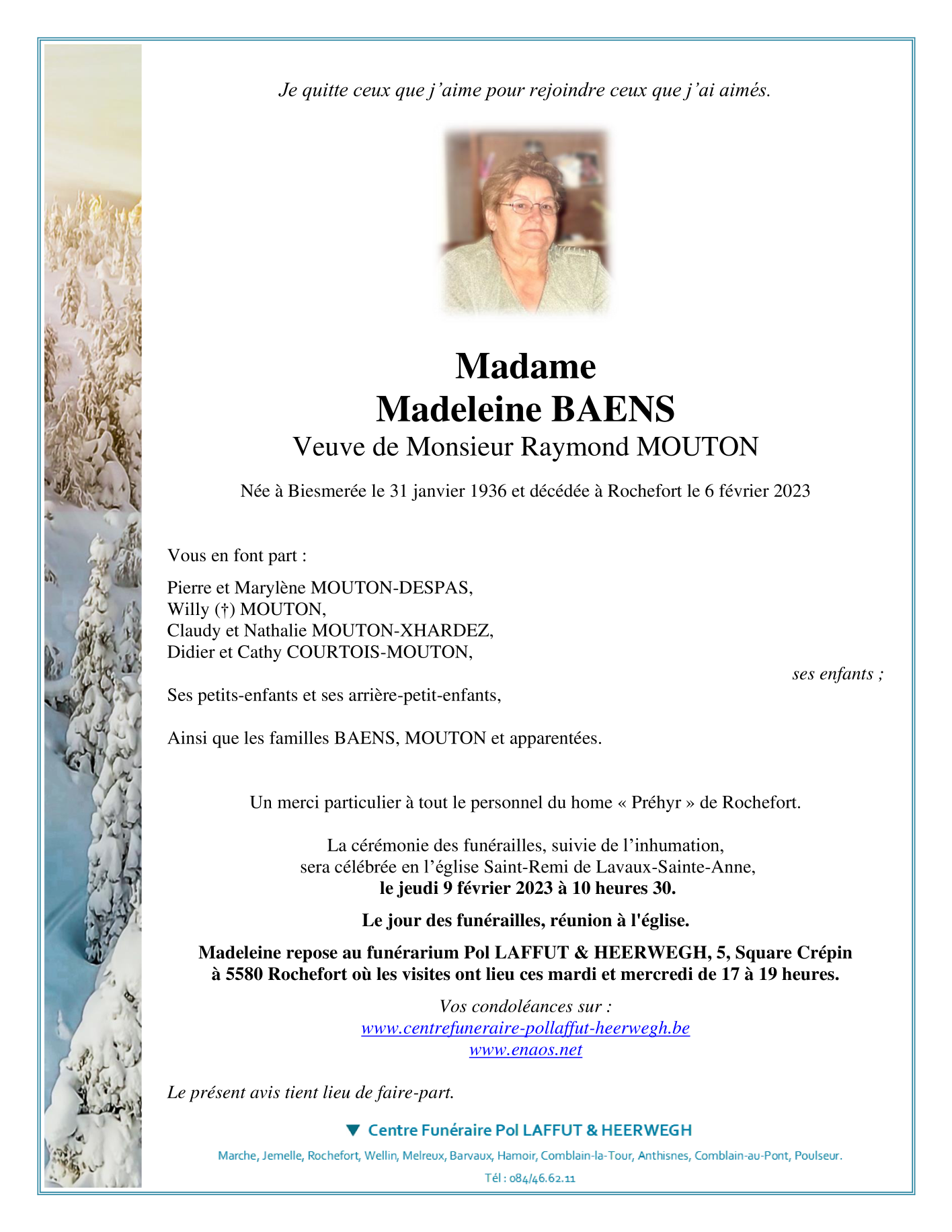 Overleden te Rochefort (5580) op maandag 6 februari 2023 op 87-jarige leeftijd