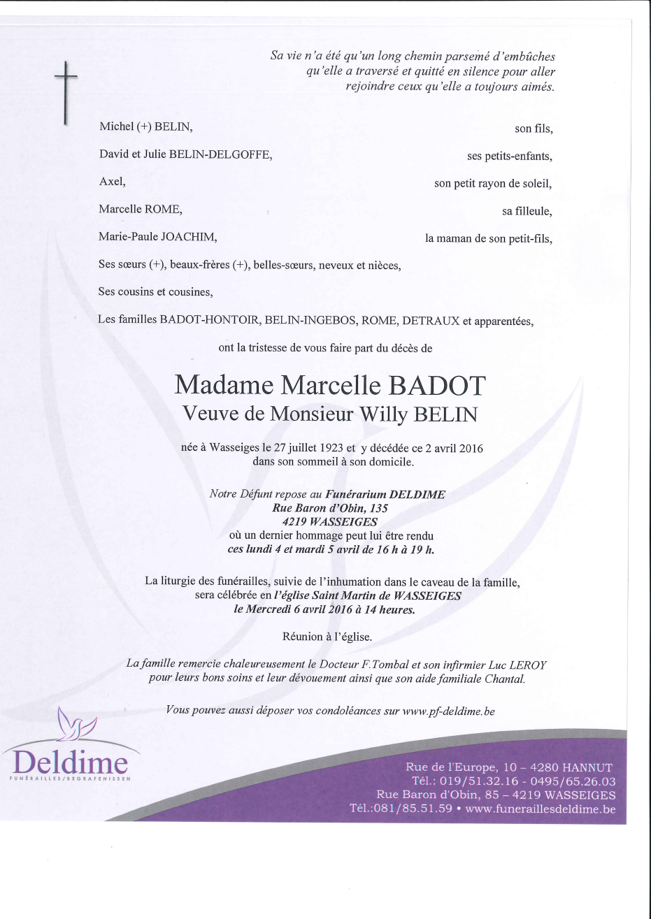 Veuve de Monsieur Willy BELIN