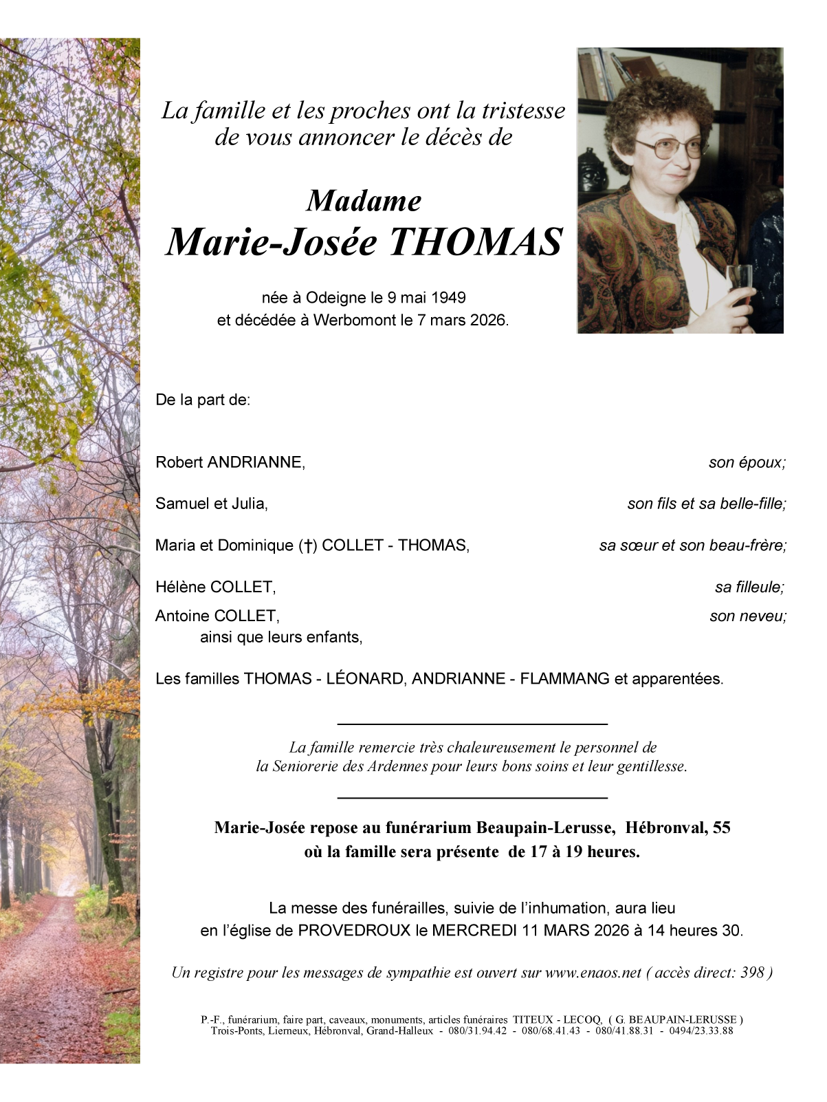 Décédée à Werbomont (4190) le samedi 7 mars 2026 à l'âge de 76 ans
