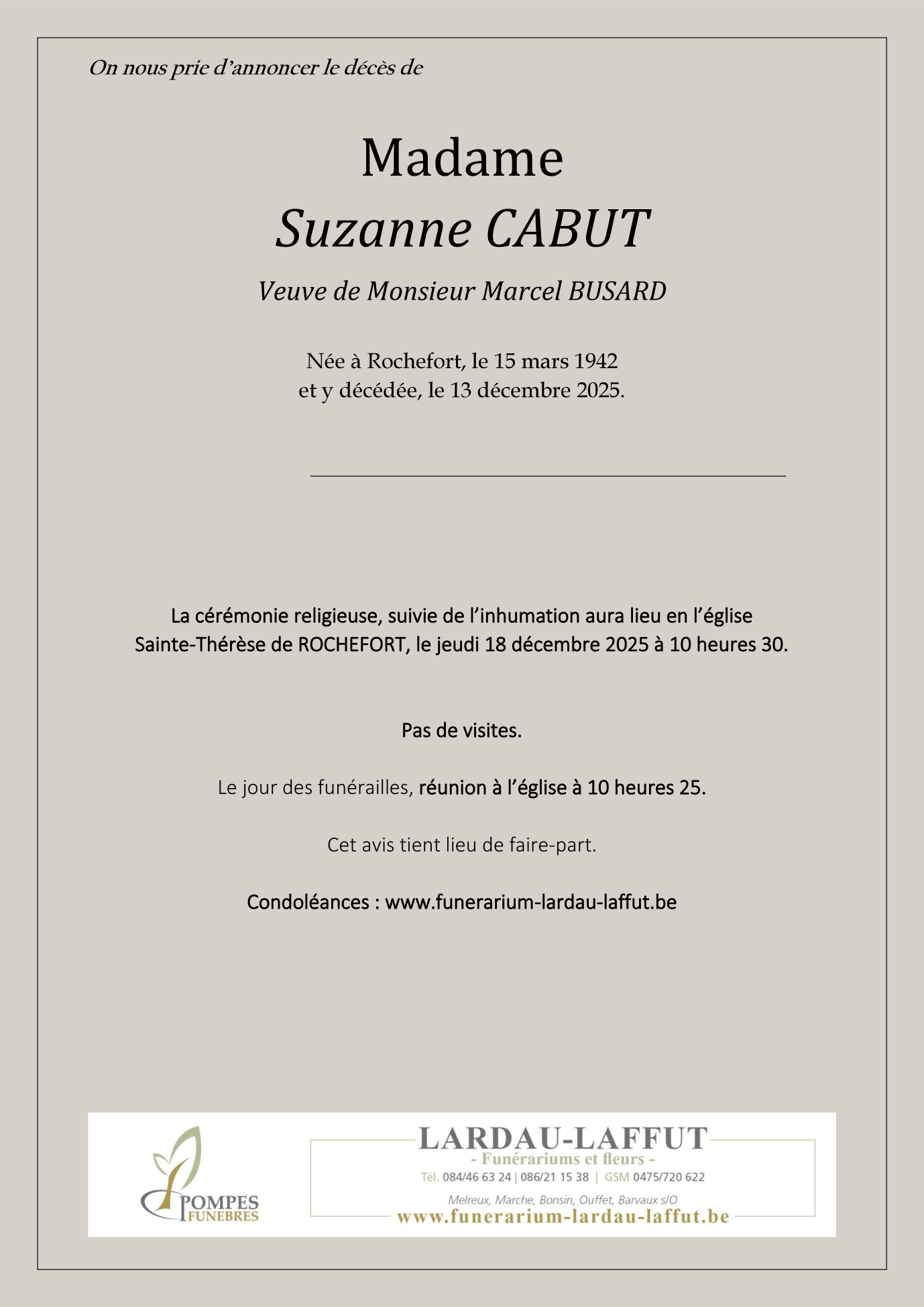 Décédée à Rochefort (5580) le samedi 13 décembre 2025 à l'âge de 83 ans