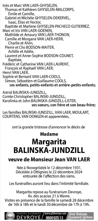 Fallecida en Ottignies (1340) el domingo, 22 de diciembre de 2024 a la edad de 93 años