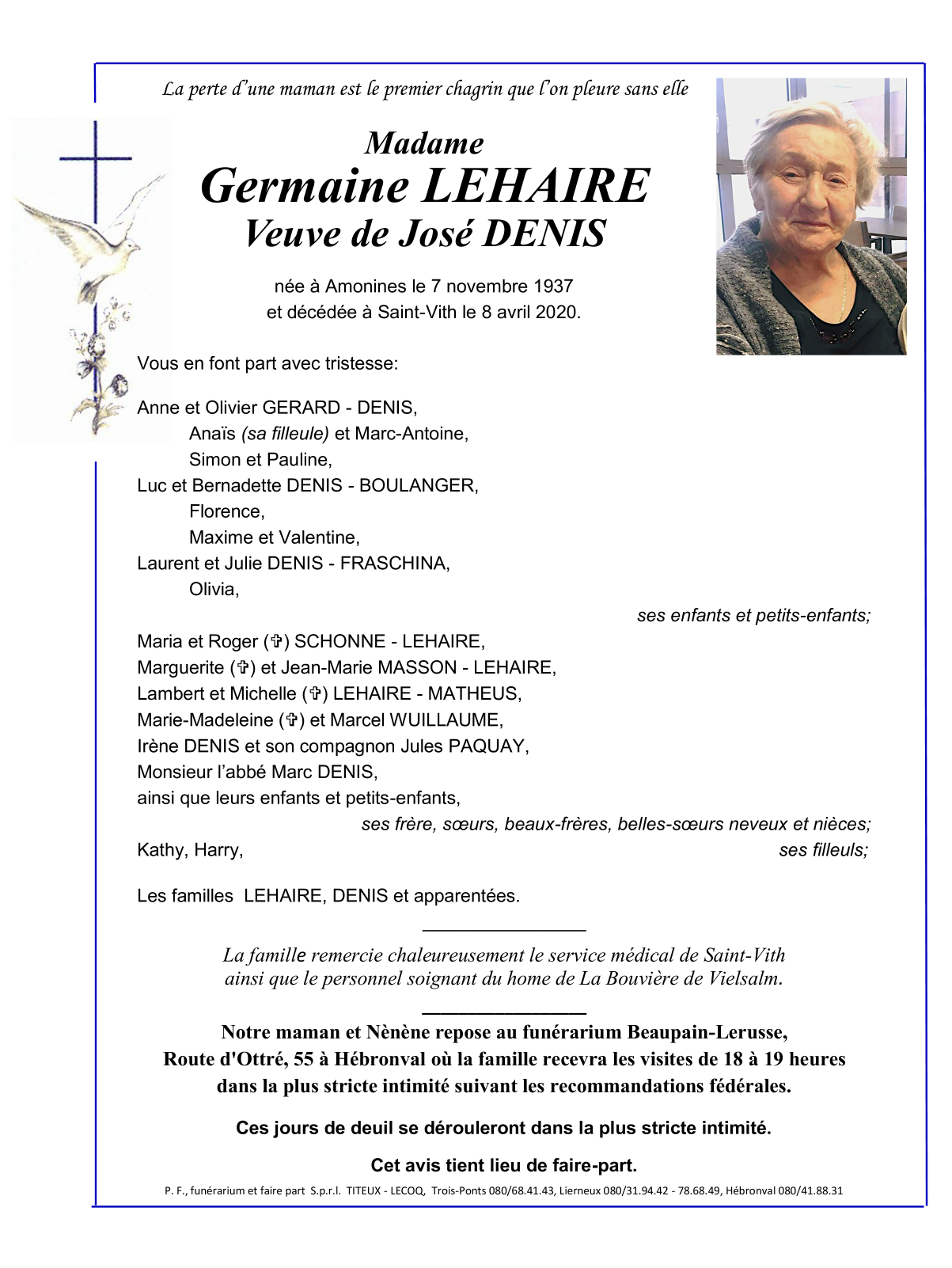 Overleden te Saint-Vith (4780) op woensdag 8 april 2020 op 82-jarige leeftijd