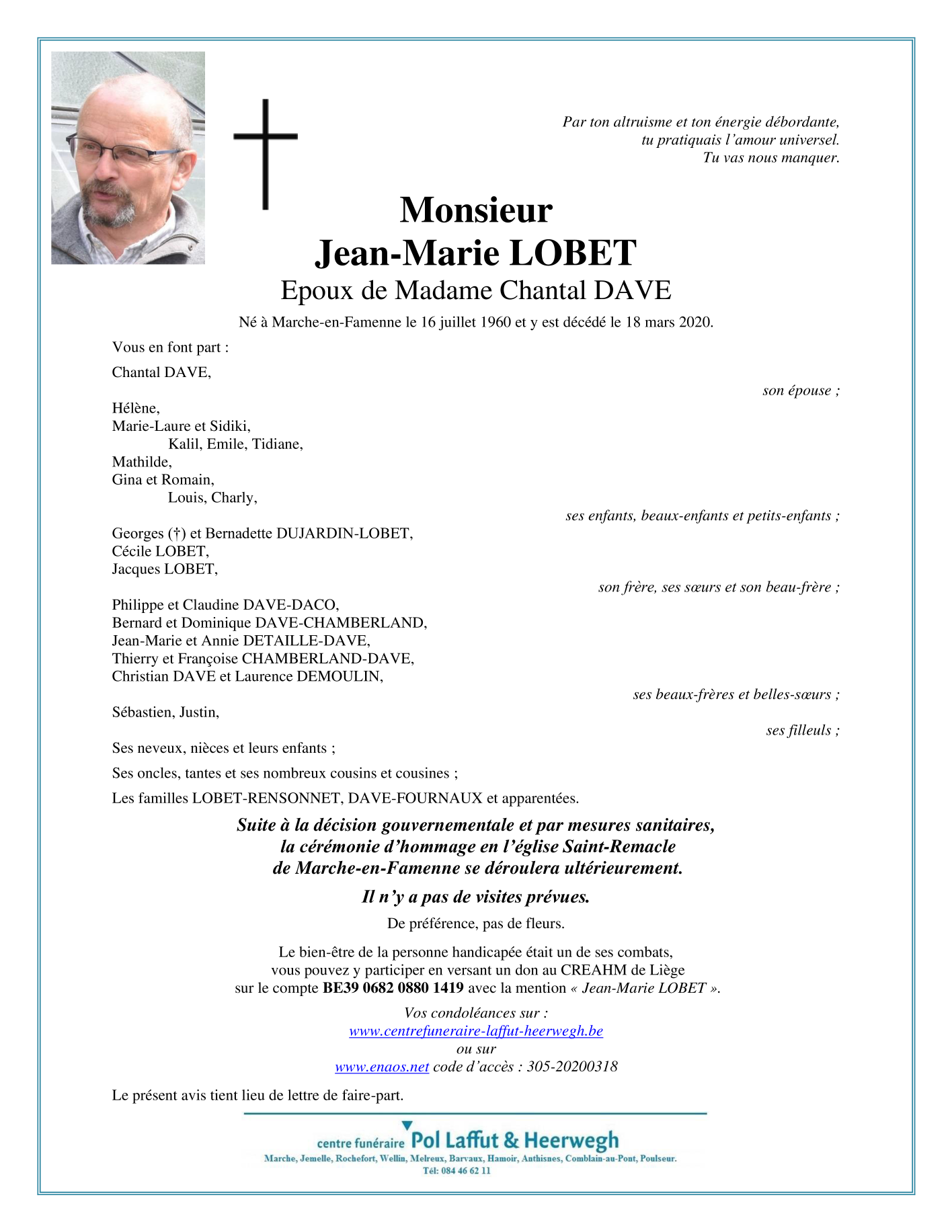 Décédé à Marche-en-Famenne (6900) le mercredi 18 mars 2020 à l'âge de 59 ans