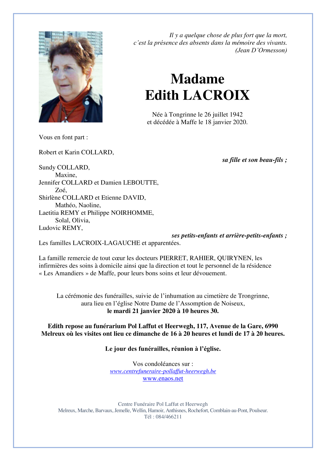 Décédée à Maffe (5374) le samedi 18 janvier 2020 à l'âge de 77 ans
