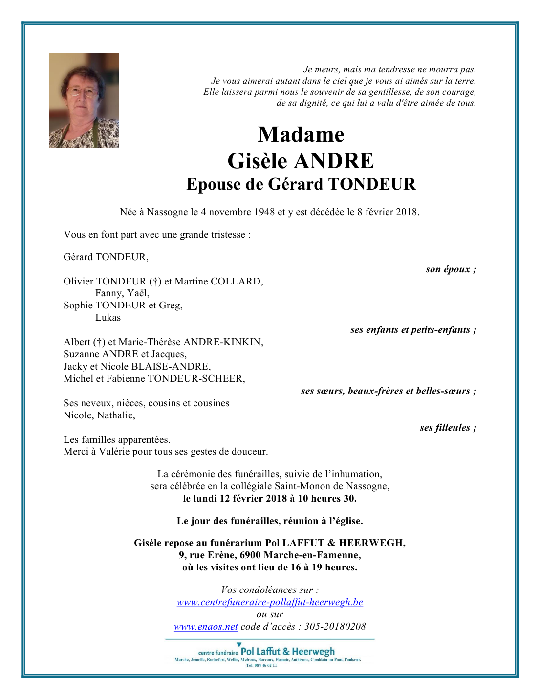 Décédée à Nassogne (6950) le jeudi 8 février 2018 à l'âge de 69 ans