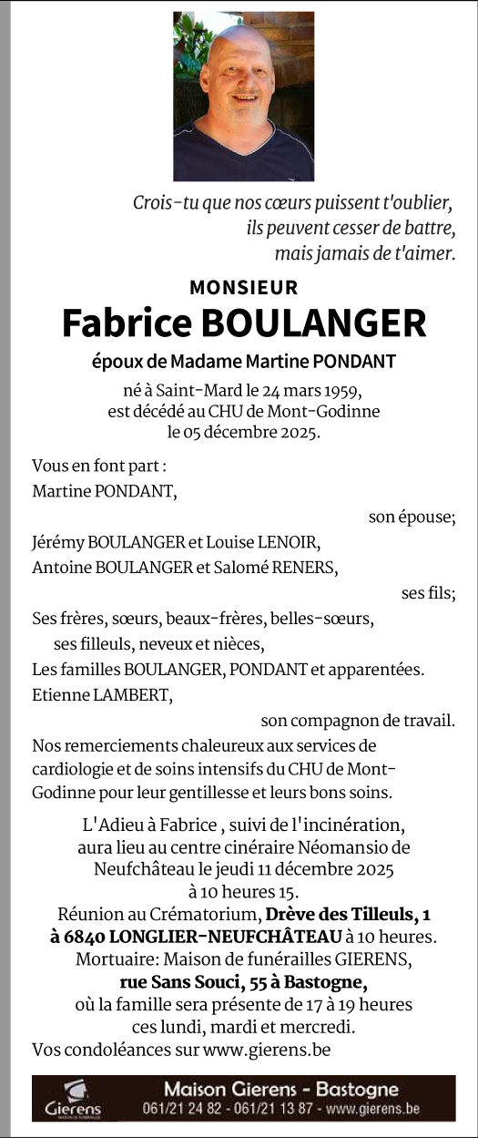 Décédé à Yvoir (5530) le vendredi 5 décembre 2025 à l'âge de 66 ans