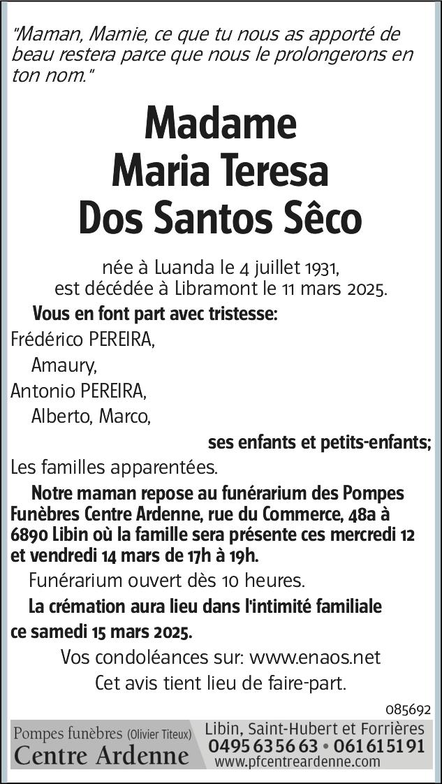 Décédée à Libramont-Chevigny (6800) le mardi 11 mars 2025 à l'âge de 93 ans
