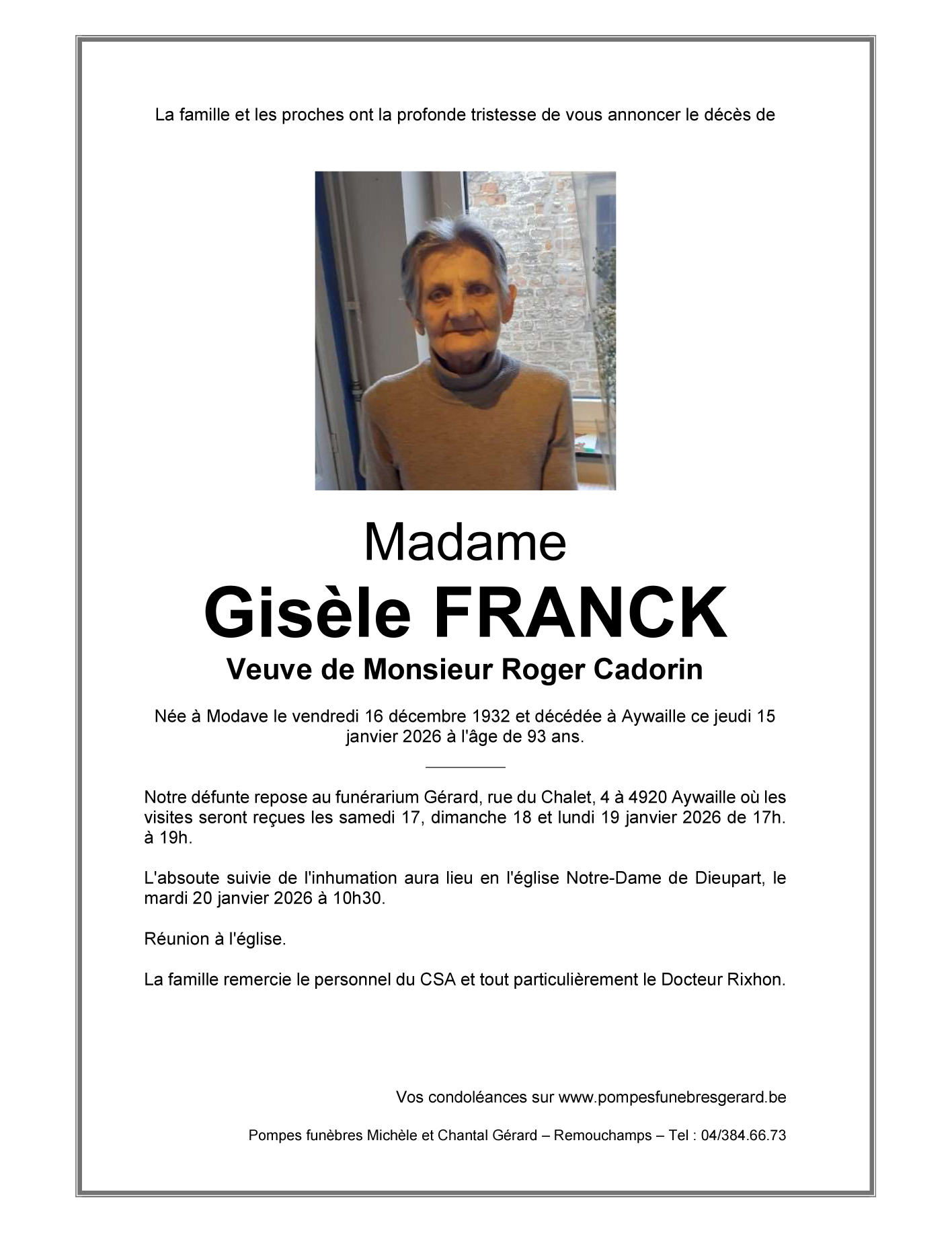 Décédée à Aywaille (4920) le jeudi 15 janvier 2026 à l'âge de 93 ans