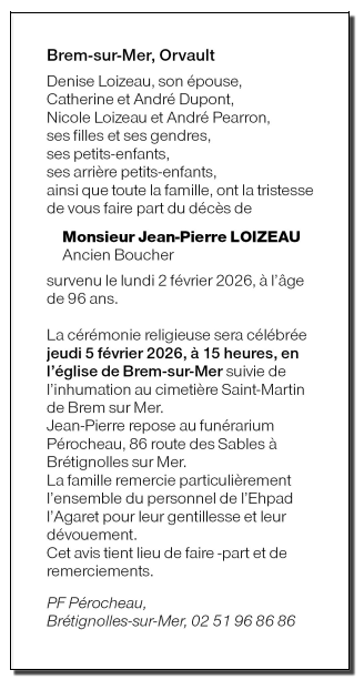 Décédé à Brem-sur-Mer (85470, France) le lundi 2 février 2026 à l'âge de 96 ans