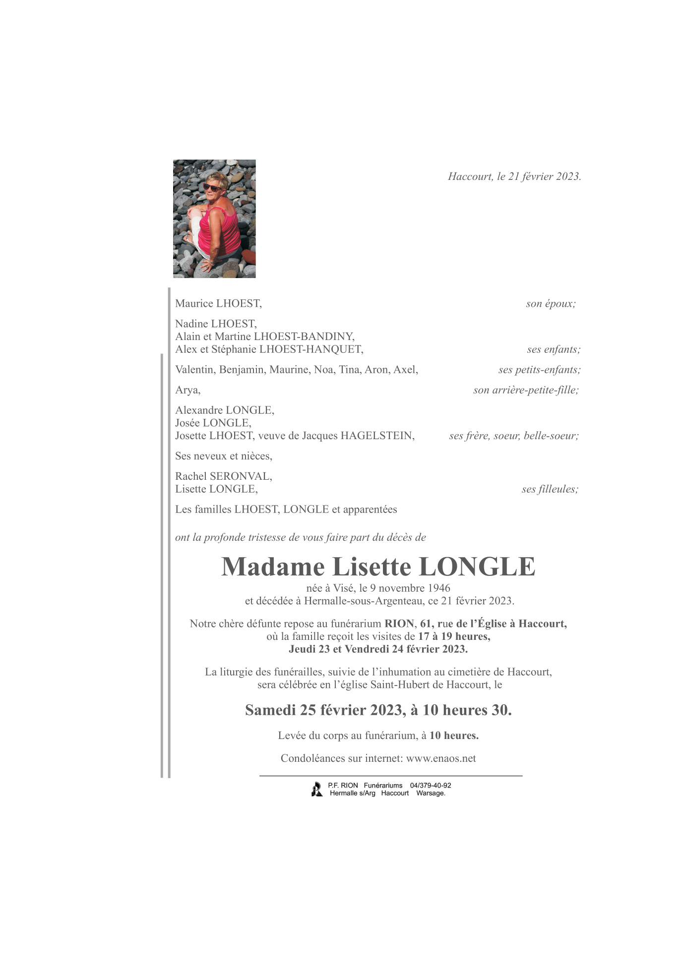 Décédée à Hermalle-sous-Argenteau (4681) le mardi 21 février 2023 à l'âge de 76 ans