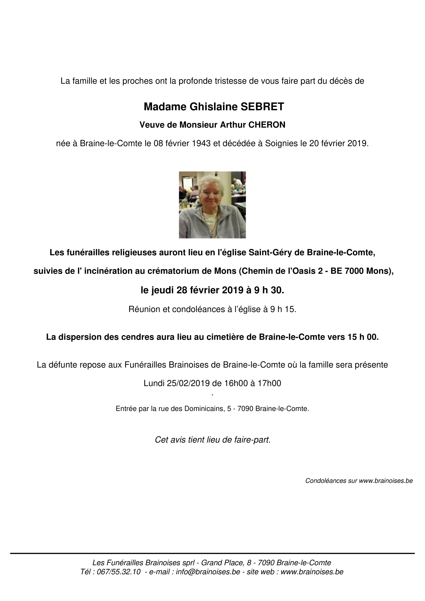 Fallecida en Soignies (7060) el miércoles, 20 de febrero de 2019 a la edad de 76 años