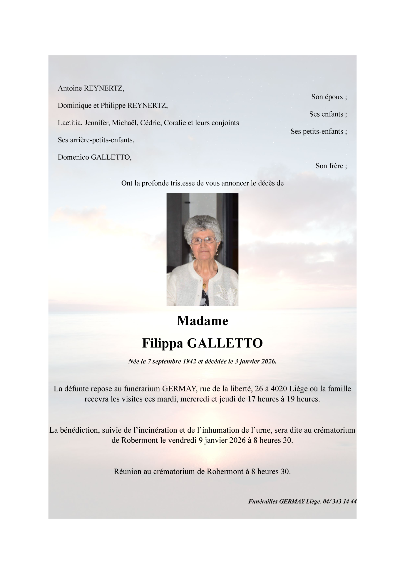 Décédée à Liège (4020) le samedi 3 janvier 2026 à l'âge de 83 ans