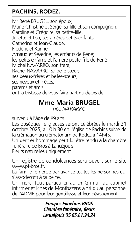 Décédée à Vaureilles (12220, France) le vendredi 17 octobre 2025 à l'âge de 89 ans