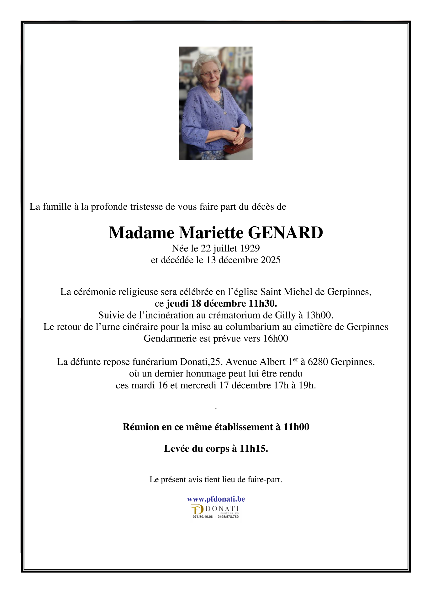 Décédée à Marcinelle (6001) le samedi 13 décembre 2025 à l'âge de 96 ans