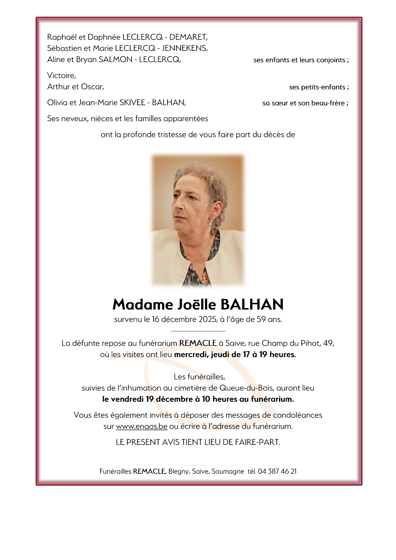 Died in Liège (4000) on 17 December 2025 at the age of 59 years