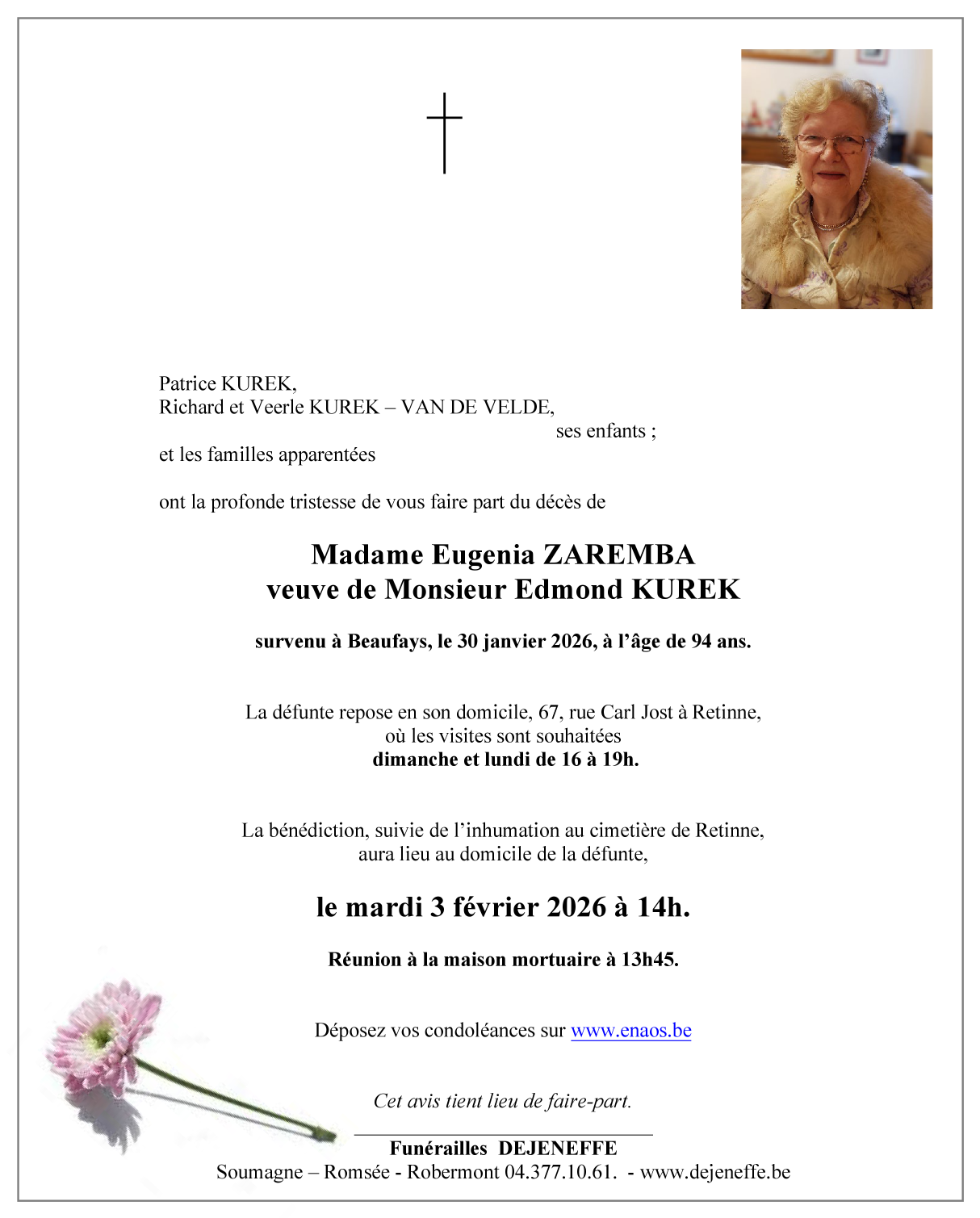 Décédée à Beaufays (4052) le vendredi 30 janvier 2026 à l'âge de 94 ans