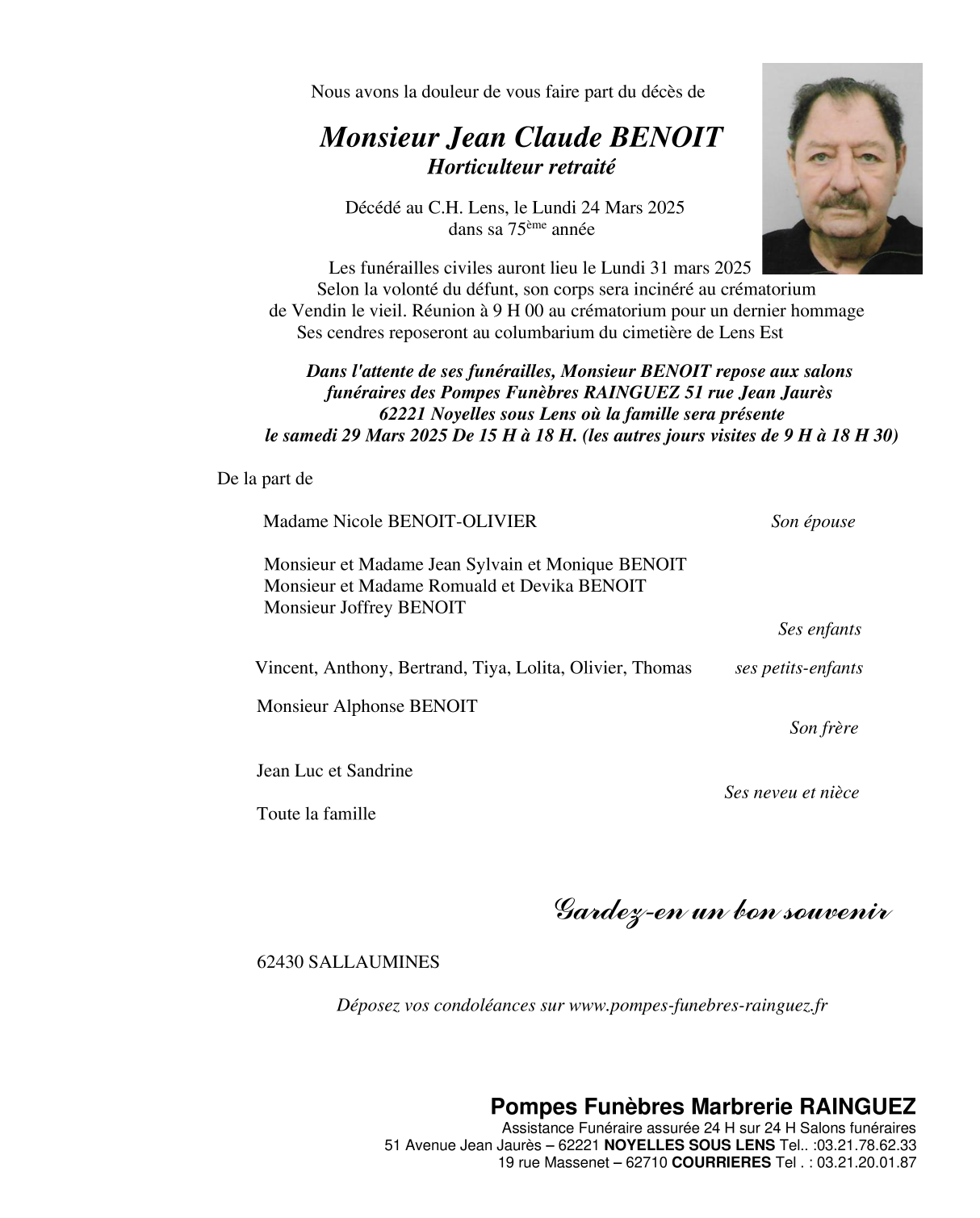 Décédé à Lens (62300, France) le lundi 24 mars 2025 à l'âge de 74 ans