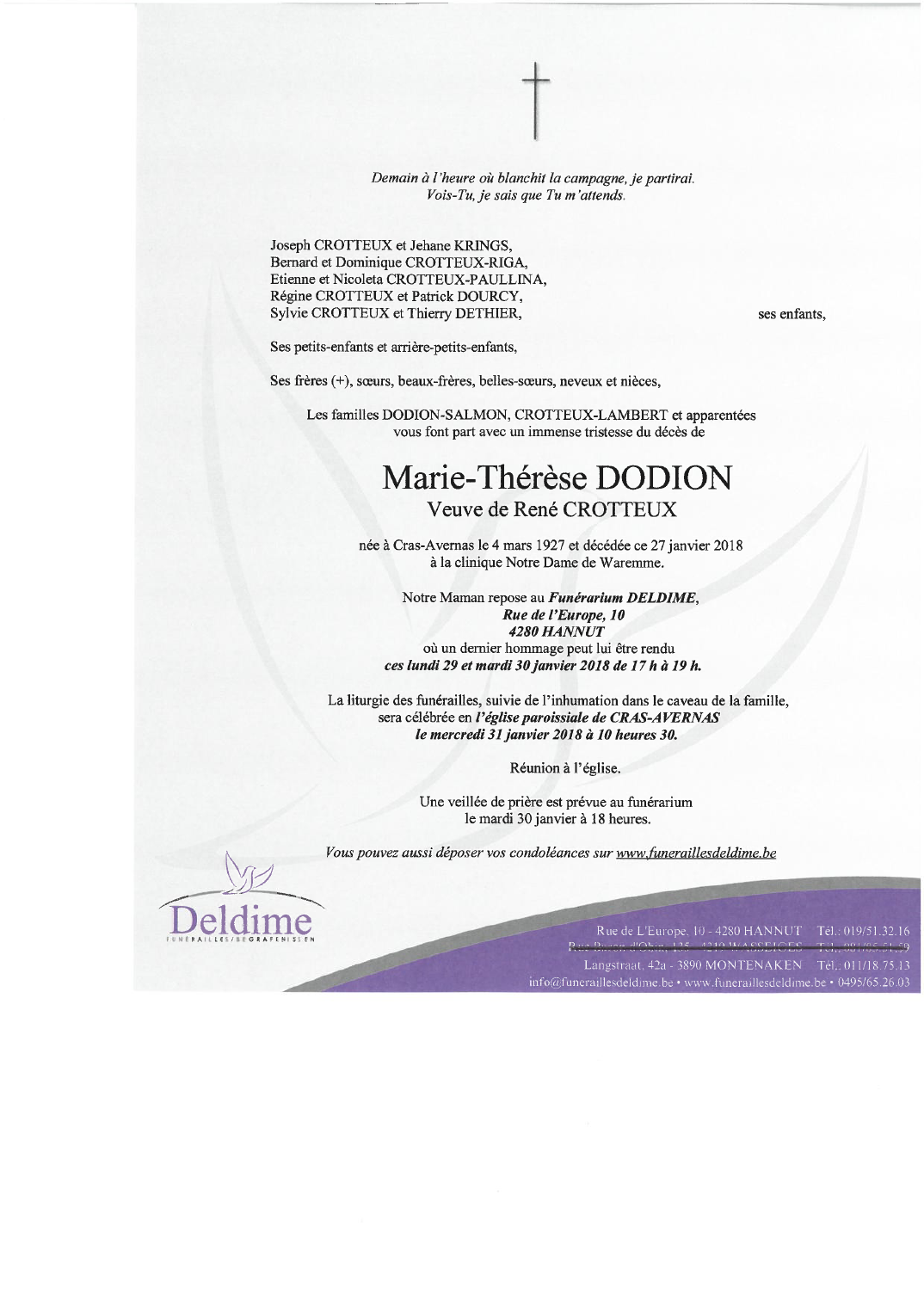 Fallecida en Waremme (4300) el sábado, 27 de enero de 2018 a la edad de 90 años
