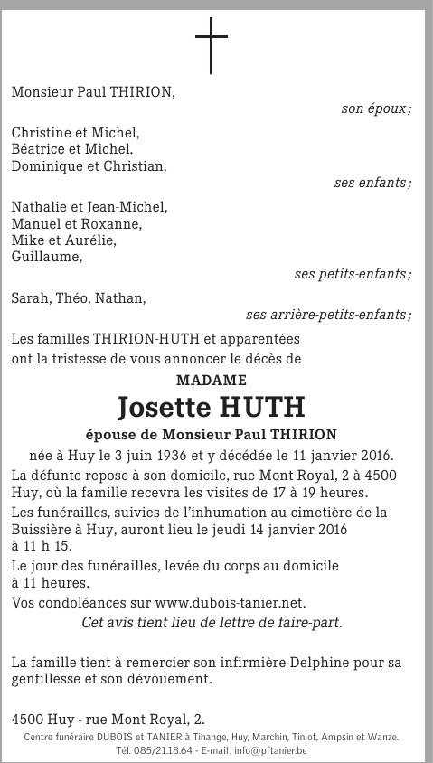 Décédée à Huy (4500) le lundi 11 janvier 2016 à l'âge de 79 ans
