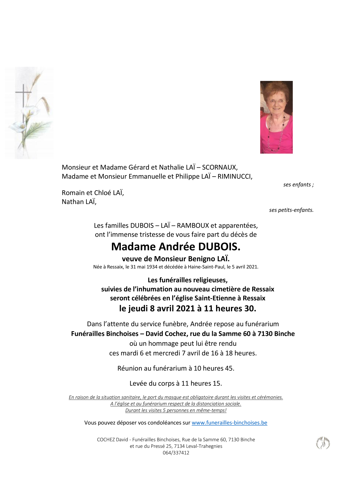 Décédée à La Louvière (7100) le lundi 5 avril 2021 à l'âge de 86 ans
