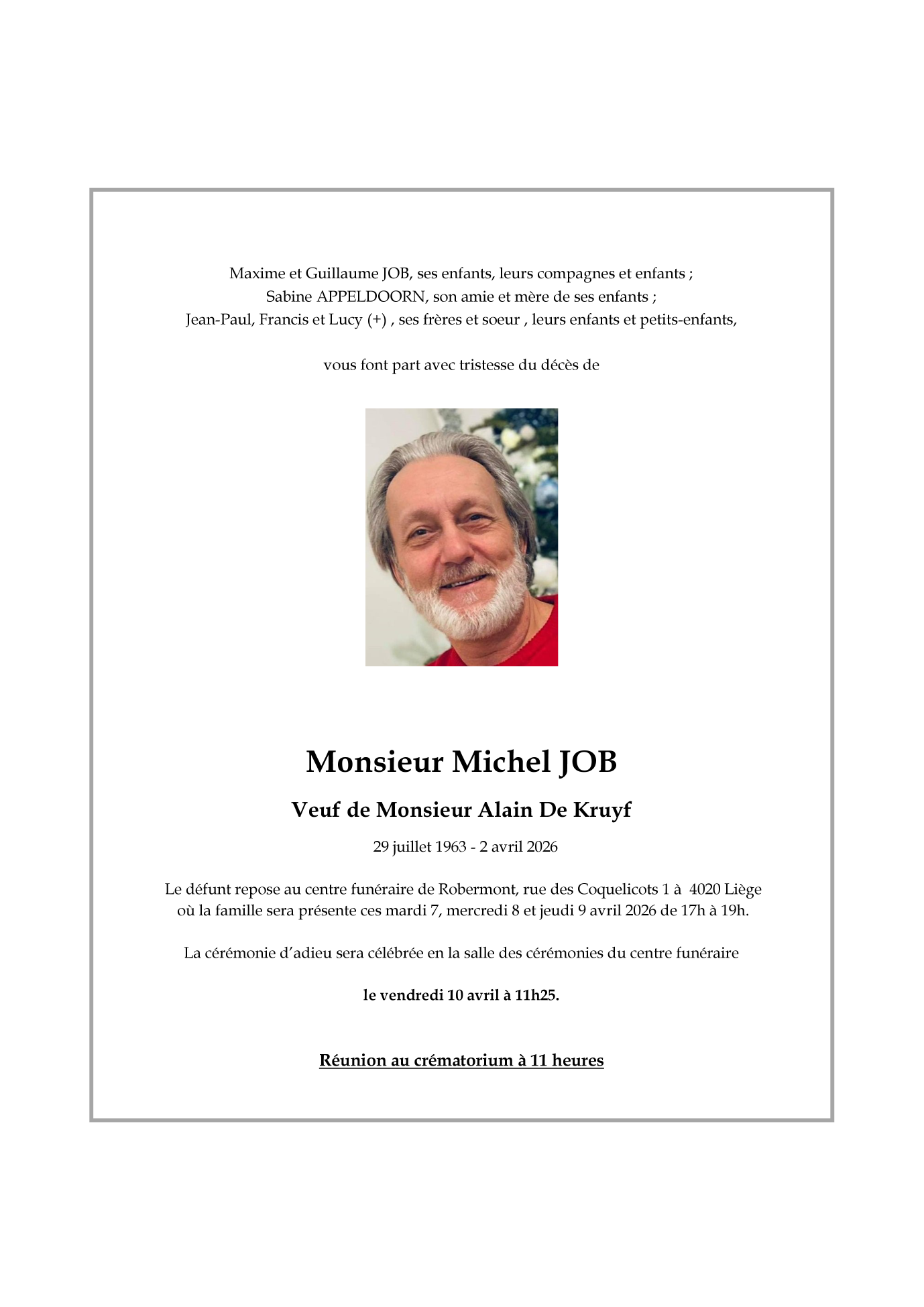 Fallecido en Flémalle (4400) el jueves, 2 de abril de 2026 a la edad de 62 años
