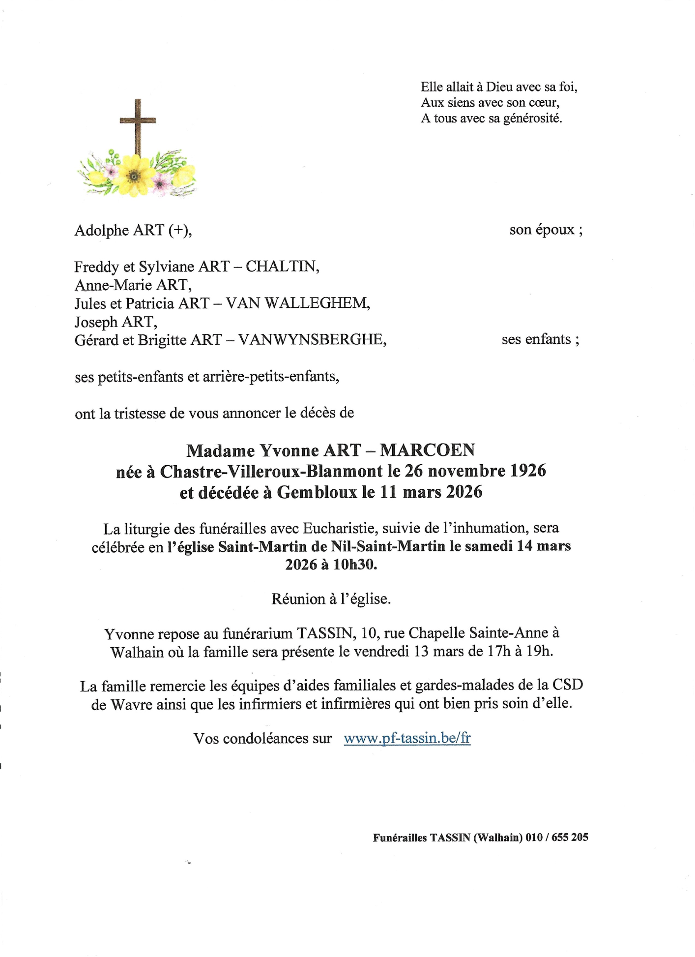 Décédée à Gembloux (5030) le mercredi 11 mars 2026 à l'âge de 99 ans