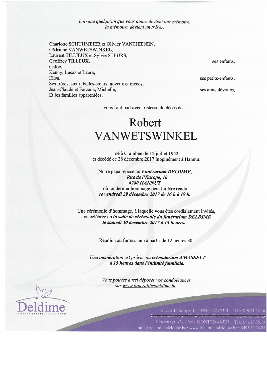 Décédé à Hannut (4280) le jeudi 28 décembre 2017 à l'âge de 65 ans