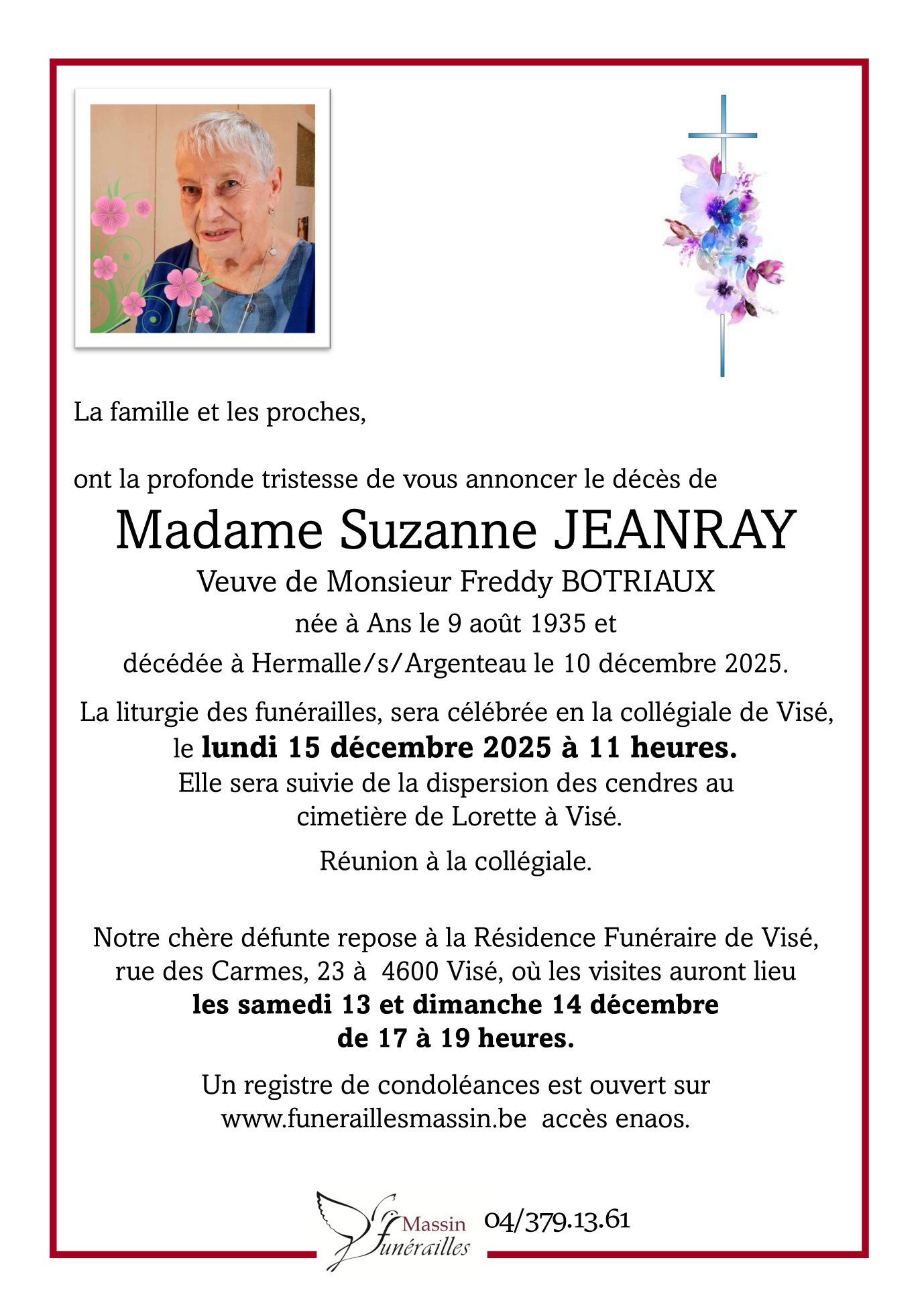 Décédée à Hermalle-sous-Argenteau (4681) le mercredi 10 décembre 2025 à l'âge de 90 ans