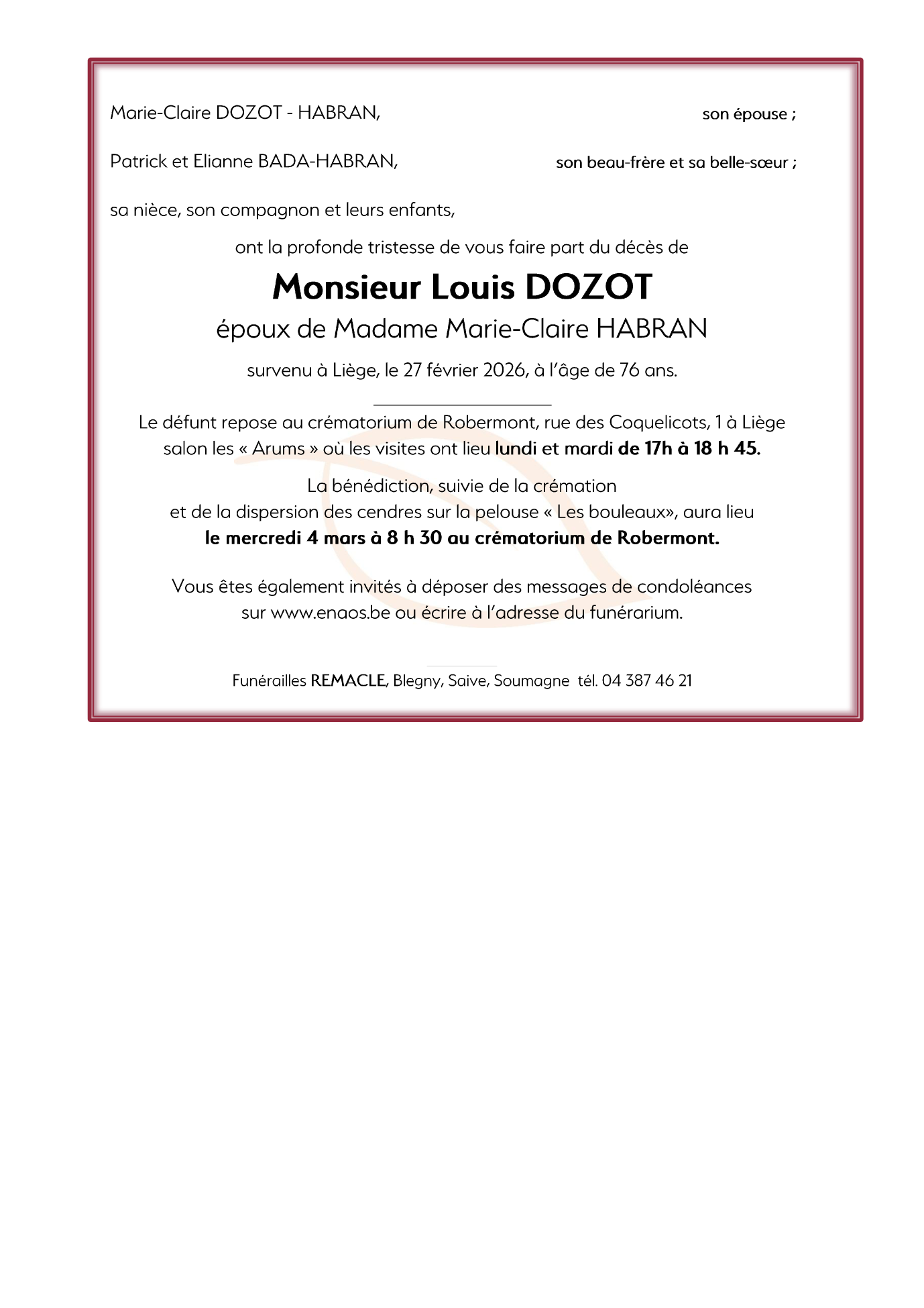 Décédé à Liège (4020) le vendredi 27 février 2026 à l'âge de 76 ans