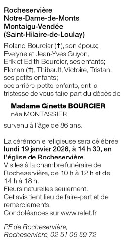 Fallecida en Rocheservière (85620, Francia) el jueves, 15 de enero de 2026 a la edad de 86 años
