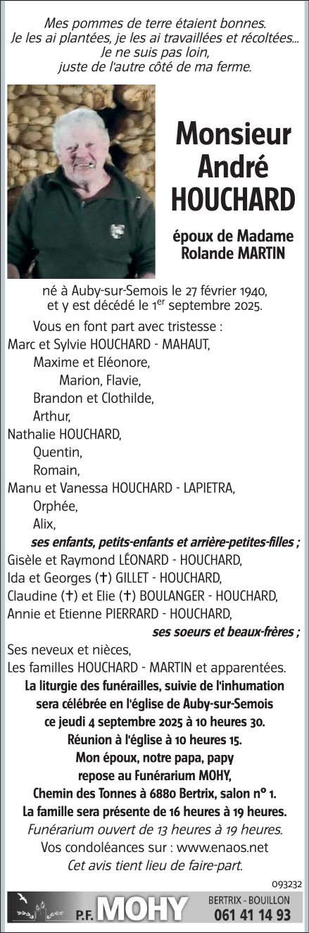 Décédé à Auby-sur-Semois (6880) le lundi 1 septembre 2025 à l'âge de 85 ans