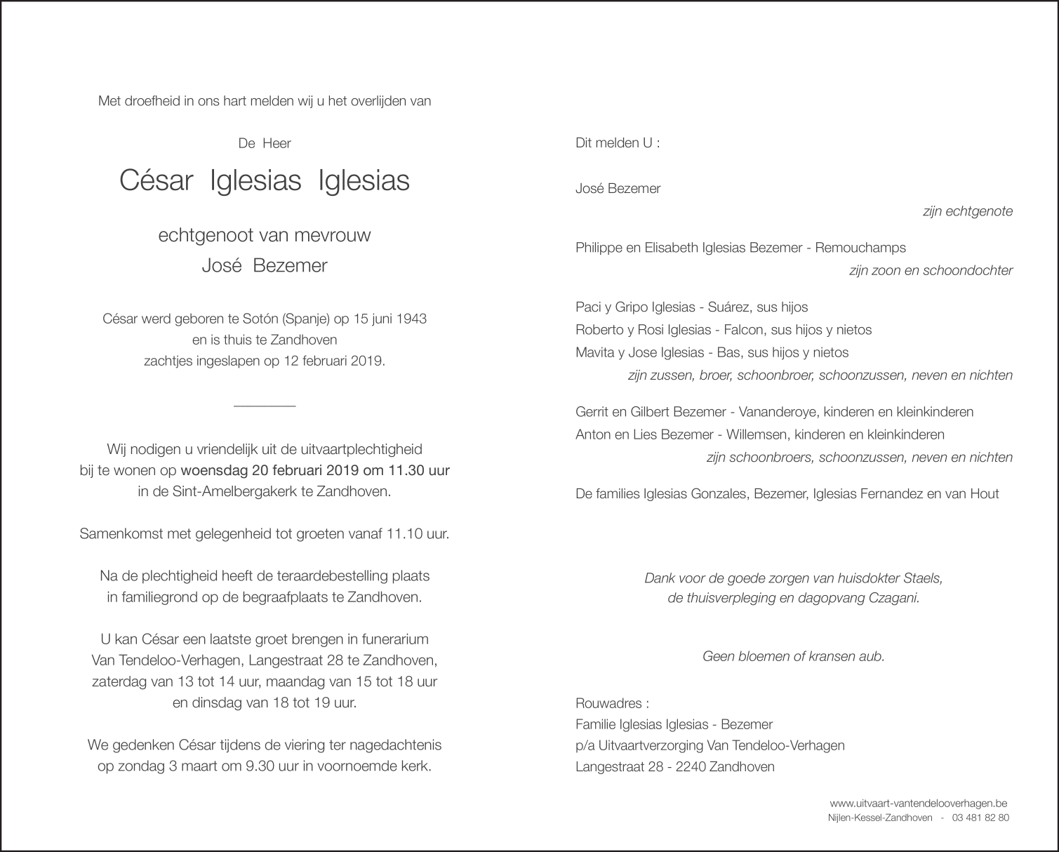 Décédé à Zandhoven (2240) le mardi 12 février 2019 à l'âge de 75 ans