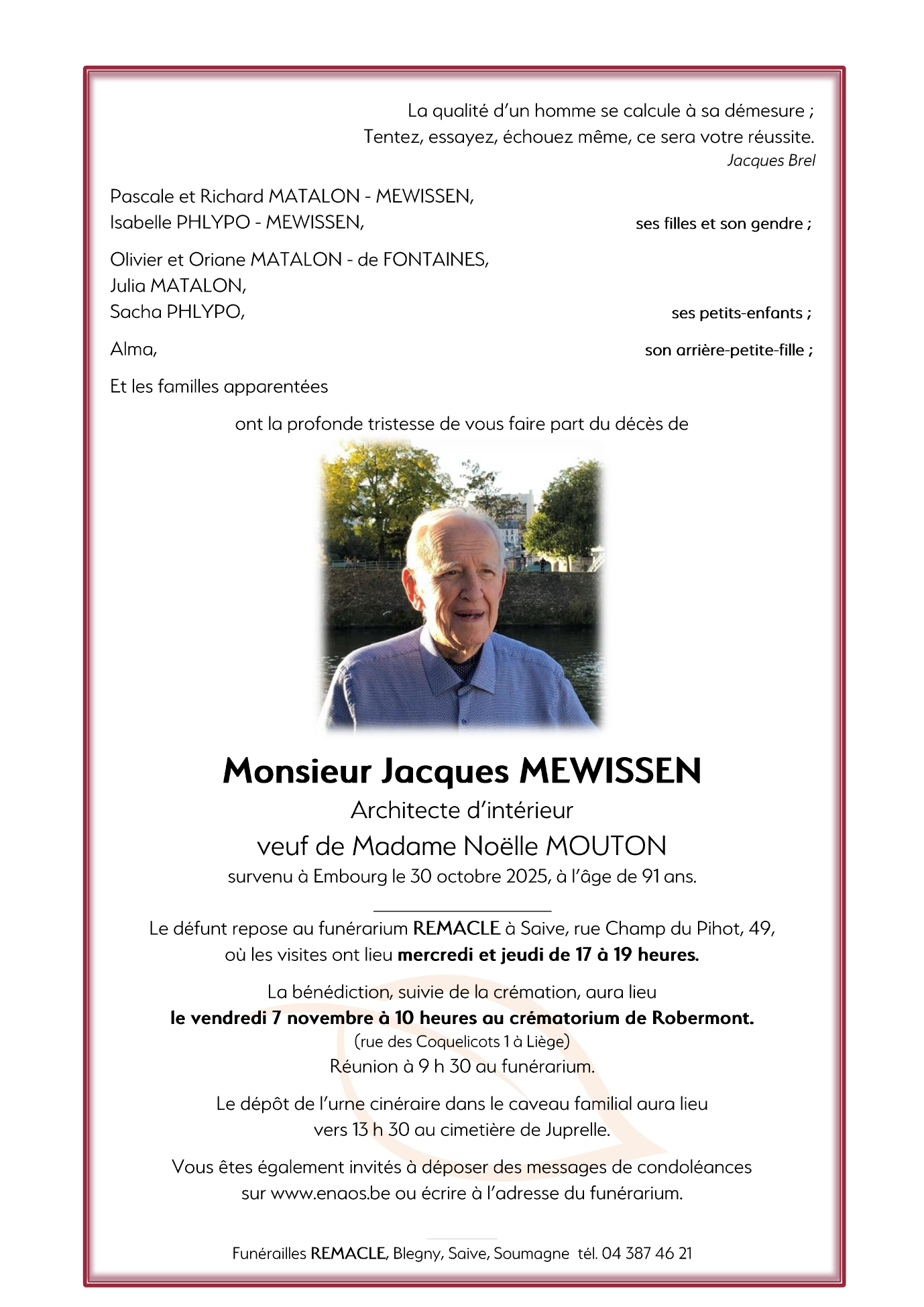 Décédé à Embourg (4053) le jeudi 30 octobre 2025 à l'âge de 91 ans